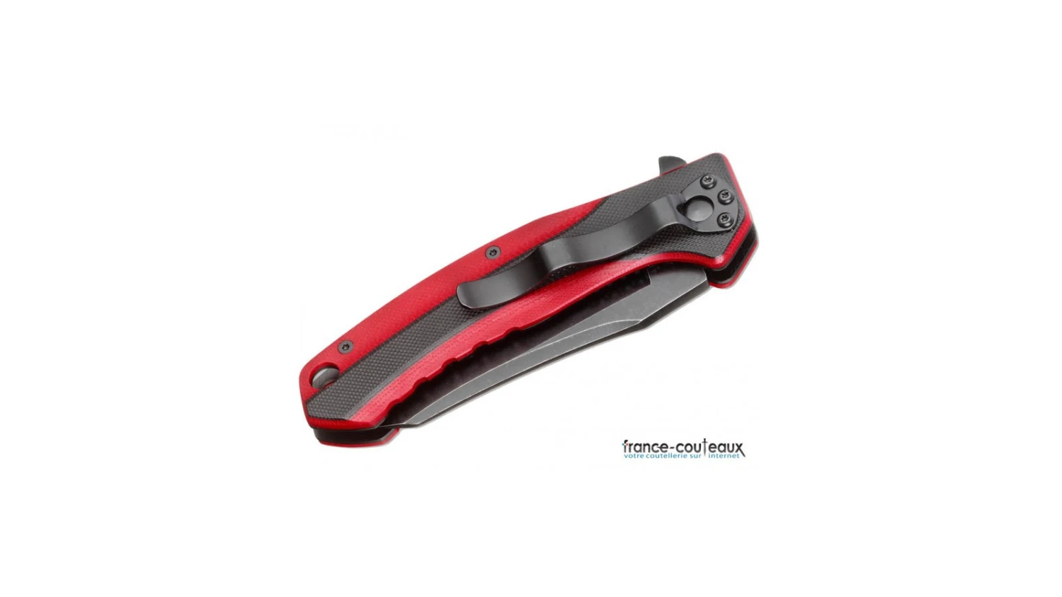 Le manche est composé de plaquette en G10 noir et rouge texturé monté sur un squelette en acier, qui comprend également un clip de ceinture, pratique pour l’emporter partout sans le perdre.