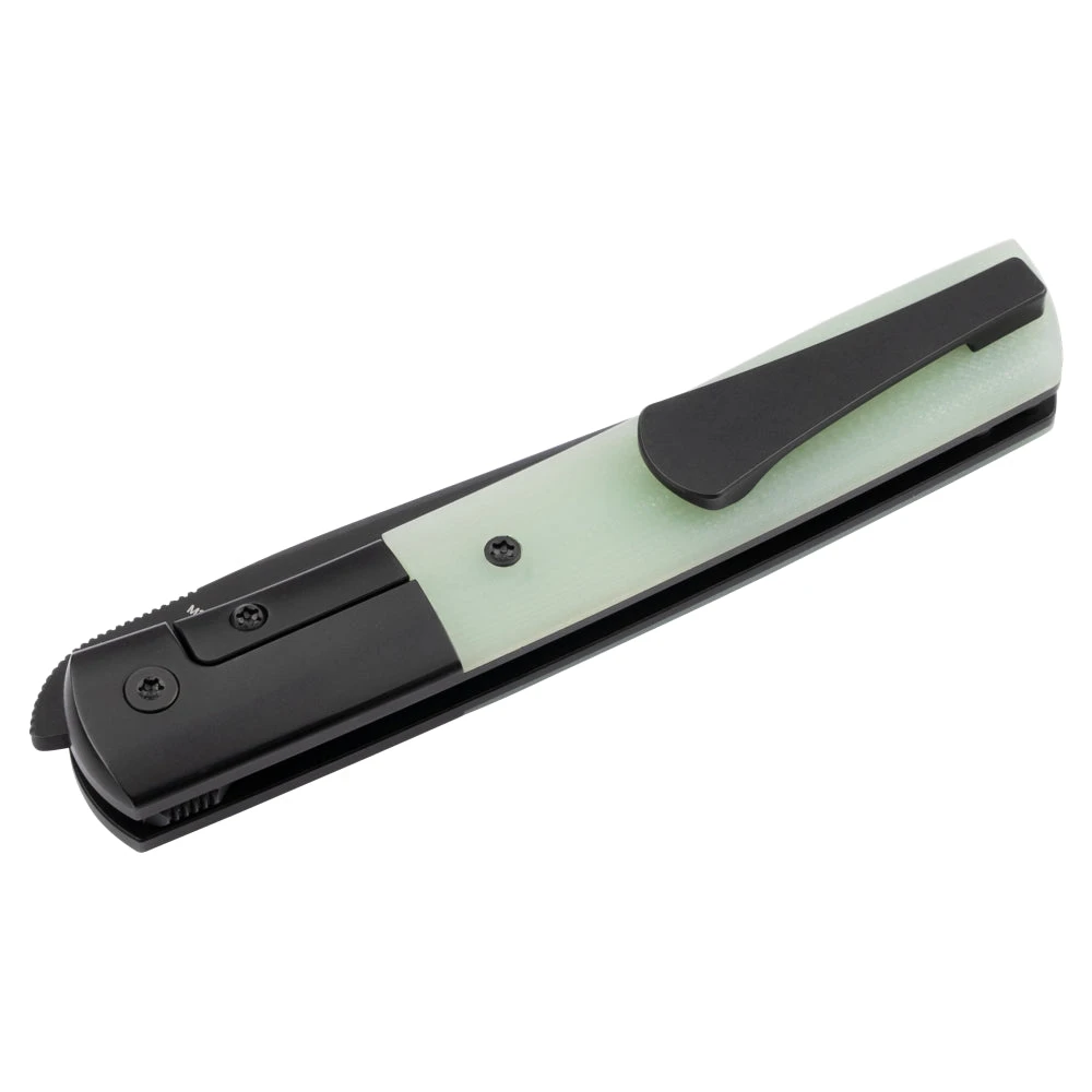 Le couteau est verrouillĂ© par un système de verrouillage Frame Lock, qui garantit que la lame reste en place pendant l’utilisation et facilite la sĂ©curitĂ© pendant le transport. Le manche est noir jade, ce qui ajoute une touche d’Ă©lĂ©gance et de sophistication Ă la conception globale du couteau.