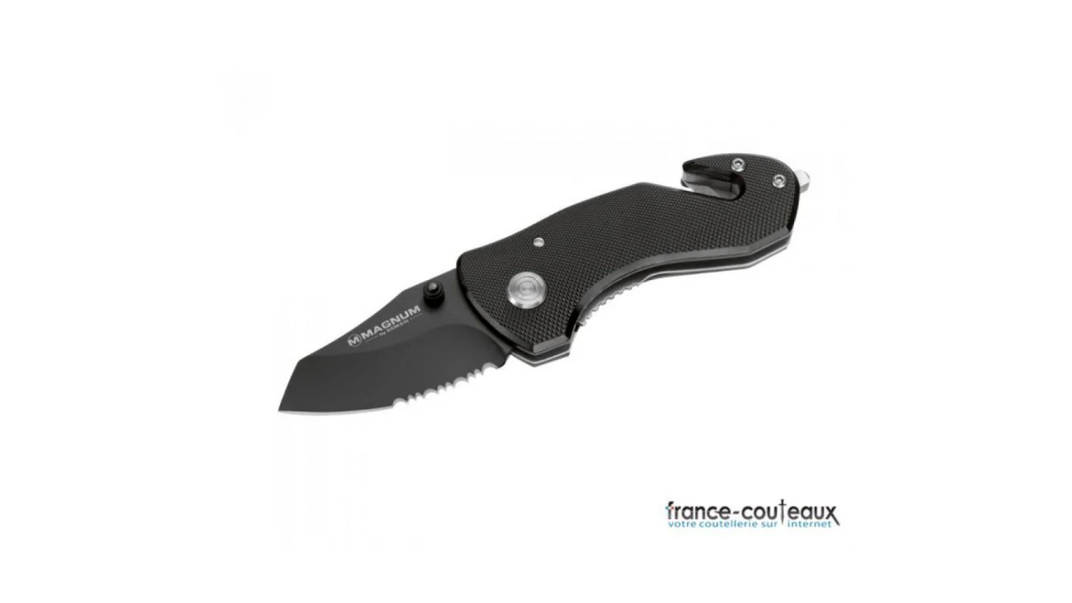 Ce petit couteau de secouriste ne doit pas ĂŞtre sous-estimĂ©, La lame en acier inoxydable 440 partiellement dentelĂ©e est verrouillĂ© par une système de liner lock. Ce couteau de poche dispose d’un coupe ceinture, d’un brise vitre. La poignĂ©e en aluminium anodisĂ© noir est Ă©quipĂ© d’un clip de poche qui peut aussi servir comme pince Ă billets.