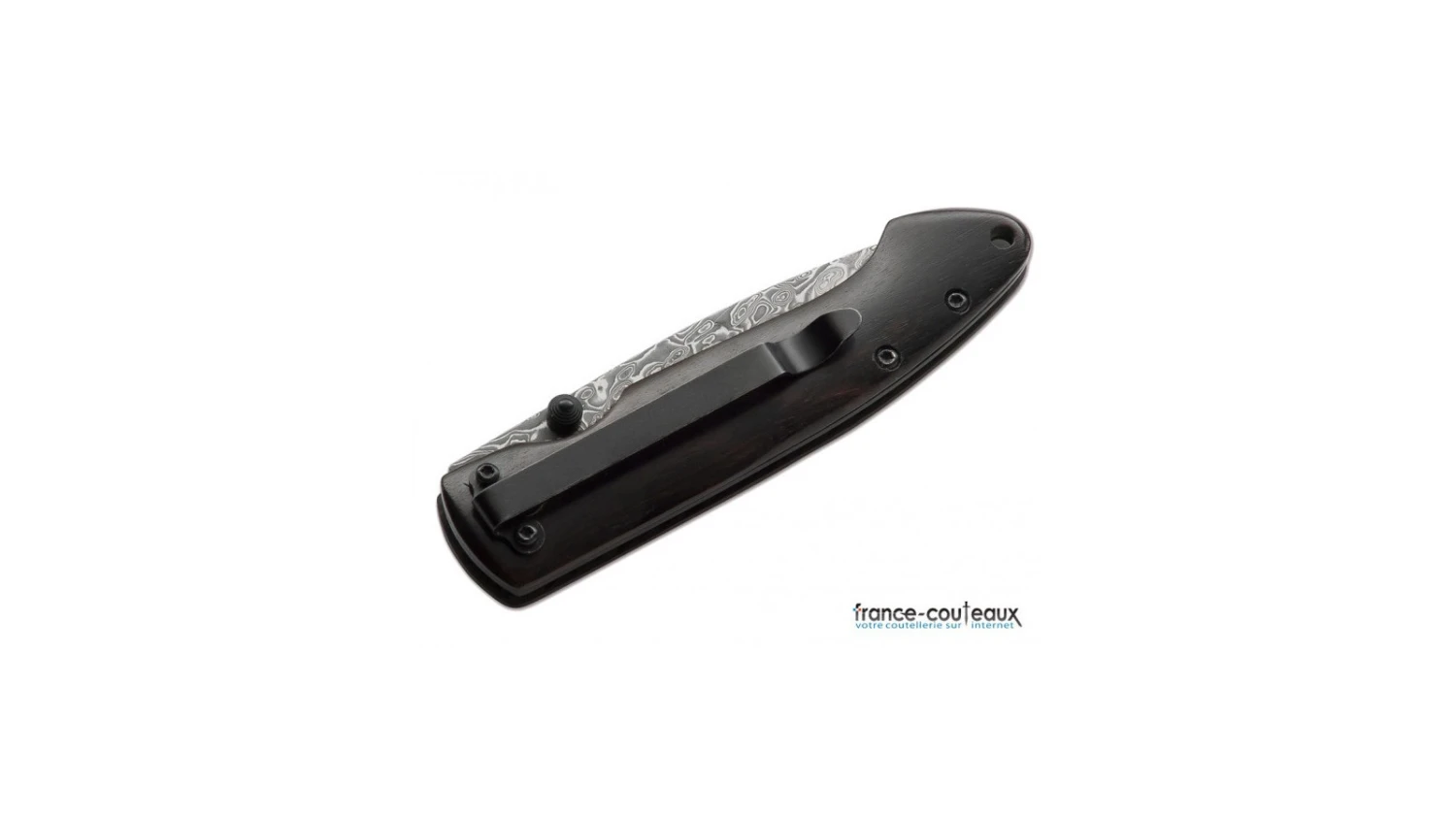 En effet, ce couteau combine à la fois une lame en acier damas très jolie, qui s’ouvre facilement avec un double bouton ambidextre avec un blocage de la lame lors de l’ouverture par système linerlock
