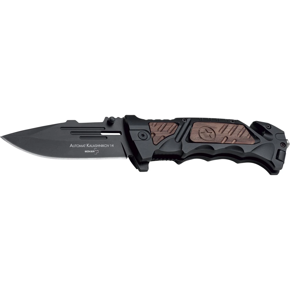 Le Couteau Pliant Multi-fonctions KAL-14 de Boker Plus est Ă©galement un produit très pratique. Il est dotĂ© d’un coupe-ceinture et d’un brise-vitre, ce qui le rend très utile en cas d’urgence. Un insert en bois dans le manche permet Ă©galement de donner une touche esthĂ©tique Ă l’ensemble.